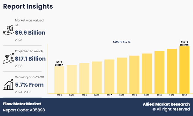According to a new report by Allied Market Research, the global flow meter market size was valued at $9.9 billion in 2023 and is projected to reach $17.1 billion by 2033, registering a CAGR of 5.7% from 2024 to 2033. Flow meters play a vital role in measuring the flow rate of liquids and gases across industries such as oil & gas, water & wastewater, chemicals, pharmaceuticals, and power generation.